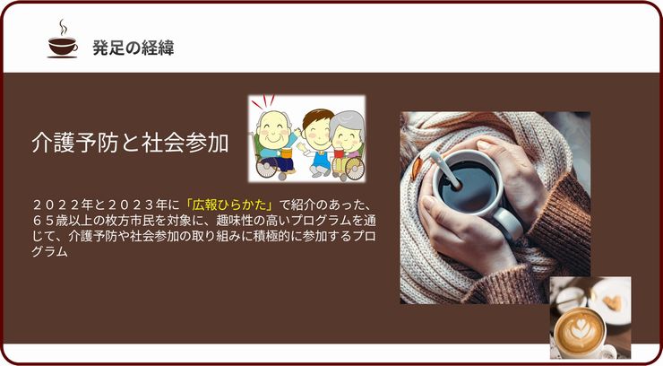 本日開始前、会場でコーヒーサービスの提供を頂きました、【SPRINGひらかた珈琲倶楽部】のボランティア活動の紹介をしていただきました。山田支部役員より、倶楽部設立の経緯、活動内容そしておいしく珈琲を入れる秘訣など、スライド上で動画なども使用してわかりやすく、かつ丁寧な紹介がありました。ちなみに最適なお湯の温度は88度Cだそうです。(珈琲の上手な入れ方の Youtubeをここから 見ることができます。)