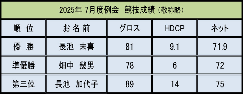 優勝は長池 末喜さん。グロス 81 、ネット 71.9 のスコアで、2024年5月以来(通算 5回目)の優勝を飾られました。おめでとうございます。なお、ネットスコアがアンダーパーは1名だけでした。