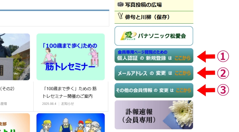 ありましたら、トップページ横の「その他の会員情報の変更はここから」(③)またはここをクリックして、手続してください。