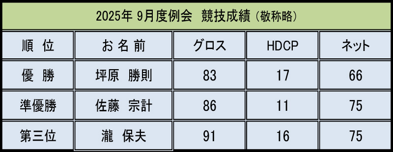 優勝は坪原 勝則さん。グロス 83 、ネット 66 の好スコアで、2024年4月以来(通算 8回目)の優勝を飾られました。おめでとうございます。なお、メンバー皆さんのハンディキャップも下がっており、ネットスコアがアンダーパーは1名だけでした。