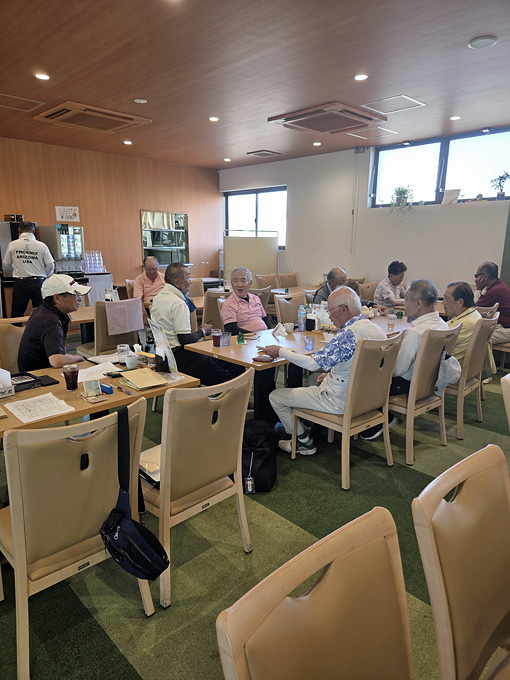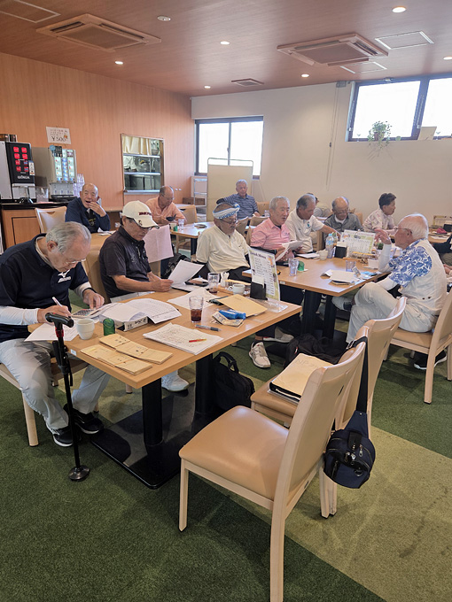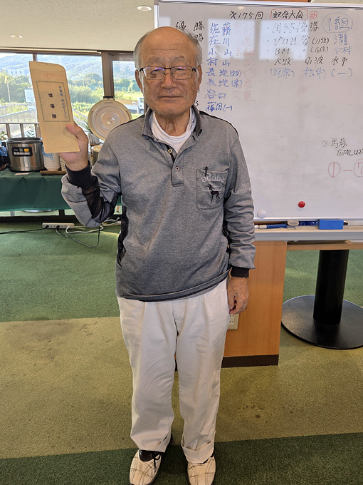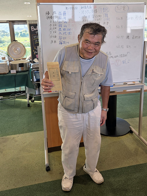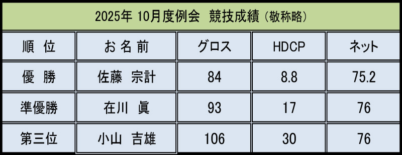 優勝は佐藤 宗計さん。グロス 84 、ネット 75.2 のスコアで、2024年11月以来(通算 7回目)の優勝を飾られました。おめでとうございます。今回、記念大会として団体戦も行われ、OUT 1組(畑中 幾男、吉田 昌弘、瀧 保夫、村山 三郎)の皆さんが、ネットスコア 74.6(4人平均)で優勝されました。その他特別賞として、ゾロ目賞(11位 : 瀧 保夫さん)、BM賞(16位 : 中村 顕さん)、大波賞(坪原 勝則さん)、小波賞(松井繁さん)、水平賞(対象無し)が授与されました。