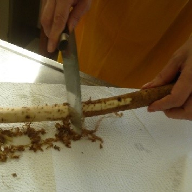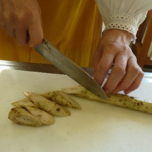 ごぼうは、包丁の背で皮をこそげ、乱切りにし水につける。