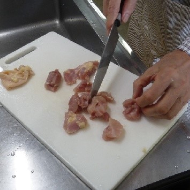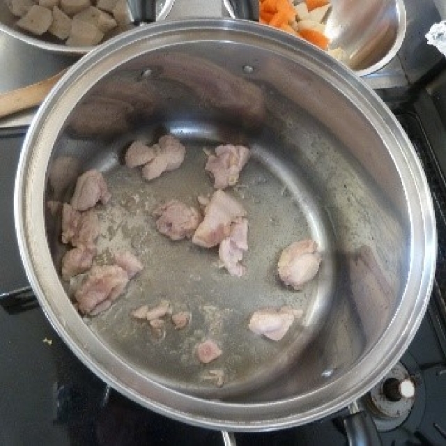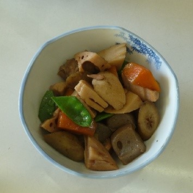 きぬさやは、食べやすい大きさに切る。 - 鍋に油をしき、鶏肉を炒め、きぬさや以外の野菜を入れ全体に油が回ったら、だし汁、さとう、みりんを加え5分煮る。沸騰してきたらアクを取り除き、しょうゆを加え「落とし蓋」をして、中火で10分煮る。落とし蓋をはずし、煮汁をさらに煮詰めていく。