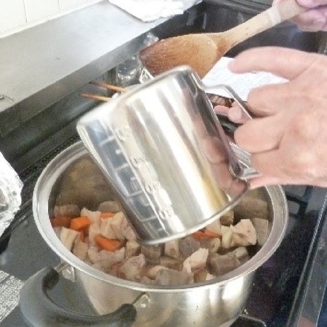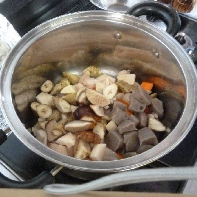 火を消し、温度が下がると味がしみ込んでいきます。(煮汁がなくなってから、味見をする) - こんにゃくは、あく抜き不要の物を使用しない時は、あく抜きをする。