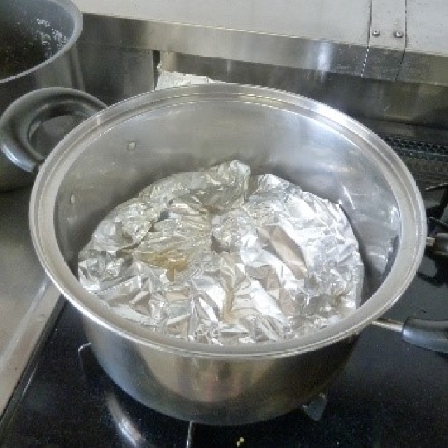 - アルミホイルで蓋を作り、約10~15分蒸し焼きする。