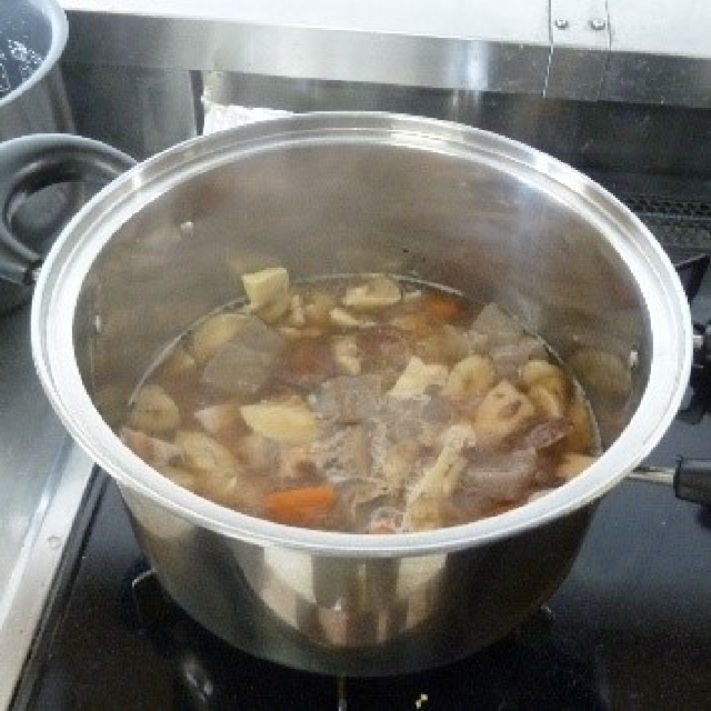 - 落し蓋をしてから10分程度で根菜類に火が通っているのを確認し、そこからは落し蓋をはずし、火加減はそのままで、煮汁をさらに煮詰めていき照りがでたら火を消します。