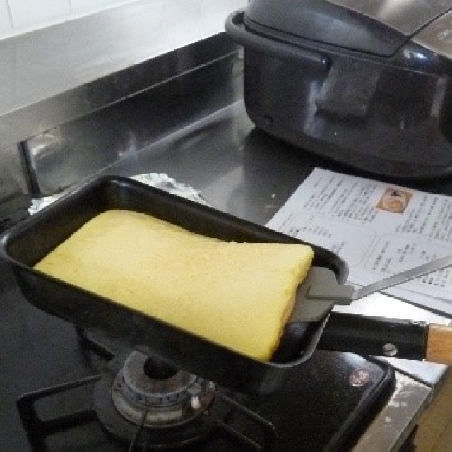 - テフロン加工の卵焼き器を熱し、卵液を少し入れ、ジュっとなれば半分入れ弱火にする。