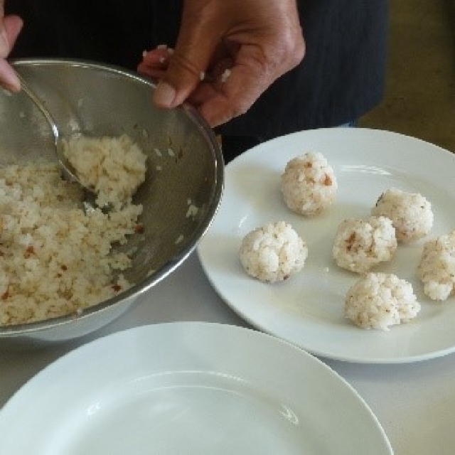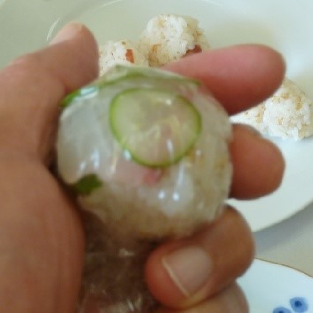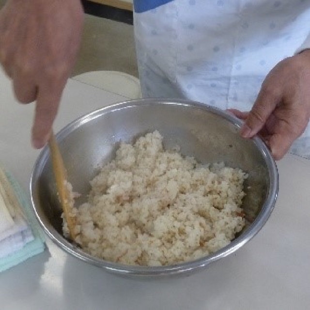 - てまり寿司の酢飯に梅干しを入れて作ります。梅干しを入れると殺菌効果があります。