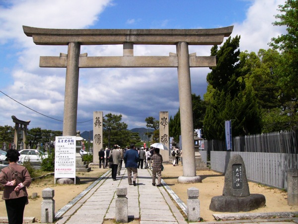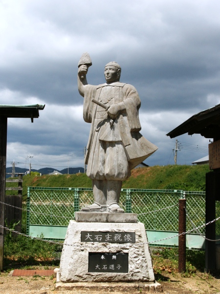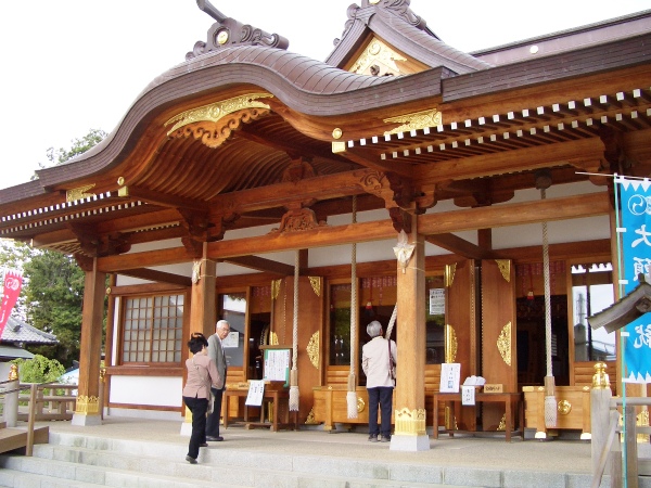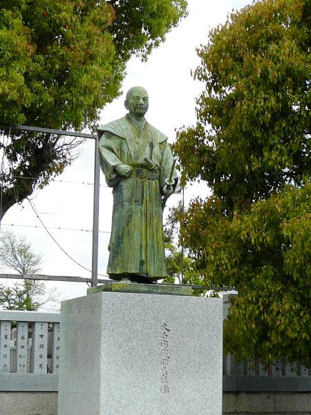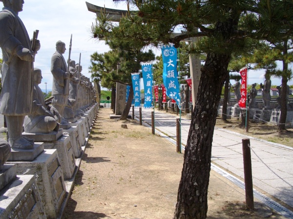 大石神社は、赤穂城址に隣接する大石良雄邸の長屋門を過ぎた所に位置している。大石良雄ら赤穂義士47人、及び中途で自害した萱野三平を主祭とし、明治33年(1900年)創建されたものである。主君の仇討という大願を果たした祭神に因み「大願成就」の神徳で信仰を集めている。 大石良雄、大石主税(ちから)父子の立派な像2体と共に、義士全体の像が参道両側に並んでいる。良雄は「よしお」ではなく、「よしたか」が正しいとガイドが強調されていたのが、何故か耳に残っている。