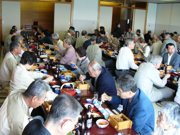 赤穂海岸方向へ約15分南下、眼下に広がる瀬戸内海の大バノラマが見える「銀波荘」で、郷土料理の穴子チラシ等の昼食を味わいながら、ビールを注ぎ交し、大いに懇親を深めることができた。昼食後はお土産を求めて日生漁港「五味の市」を訪問、漁師のおかみさん達の威勢よい声を期待したが、午後の到着のため品数も少なくなっており、さらに鮮魚中心のため土産にはしにくく、急遽少し離れた道の駅「黒井山グリーンパーク」にも立ち寄ることになった。ここで干物、フルーツ、野菜、地酒等の展示販売を見てショッピングを楽しんだ。素敵な思い出を作ってくれた瀬戸内の旅は、18時枚方に無事帰着し終了した。