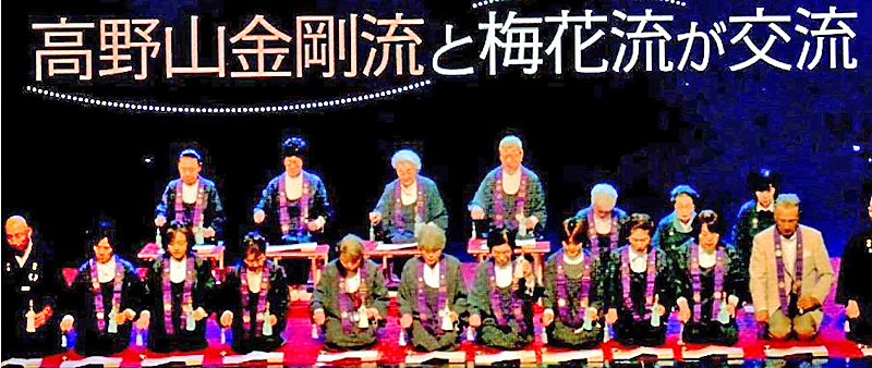 一例を示しますと「無常御和讃」という曲があります。「昨日の人は今日はなく、会えば別るる世のならい、夜半のあらしに散る花の、もろきは人の命なり」。各言葉には拍速と音階を示す音符が振られており、普通の音楽と同じです。これからも元気で居る限り御詠歌を続けていくつもりです。先年、高野山大学で行われた曹洞宗梅花流と高野山真言宗金剛流との交流会の模様を添付します。(前列右端が私です)