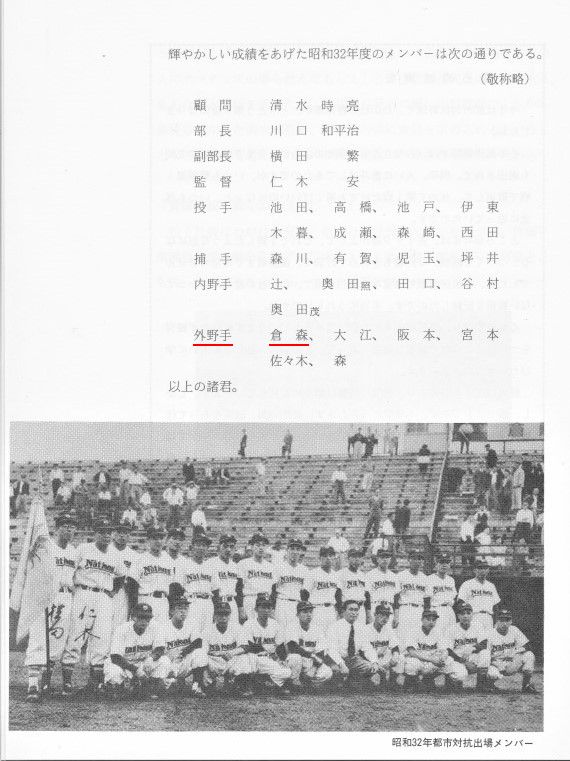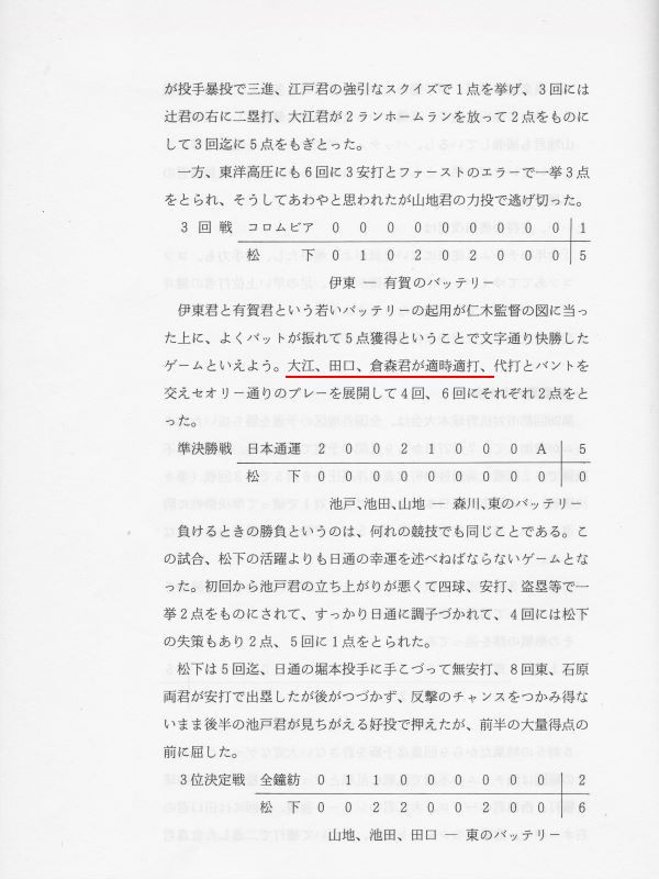 「白球のひびき 松下電器野球部30周年史(執筆:当時の遊津取締役)」に、入賞時の第3回戦にて、 大江、田口、倉森君が適時敵打 等々が記載され、懐かしい思い出です。