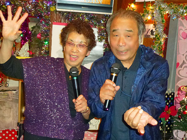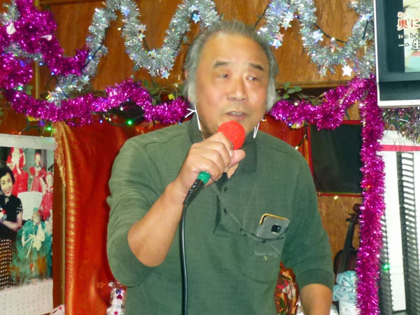 いつも明るく振舞われ、場を盛り上げてくれます。カラオケ同好会一の酒飲みで、会場である「絆」さんの経営に大変貢献されています。いつもテーマを持って参加され、鶴田浩二・石原裕次郎・舟木一夫・フランク永井・二葉百合子・ディックミネさんの歌を、ある時は物まねで、ある時は色っぽく歌われます。