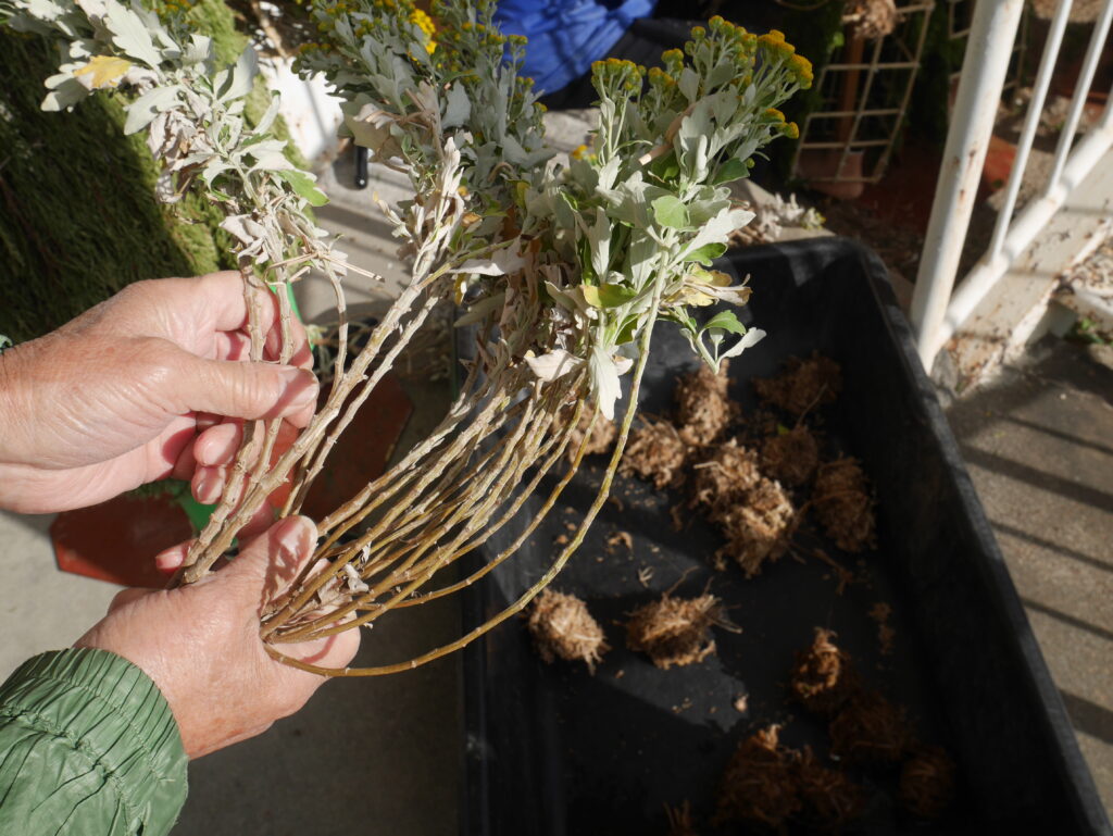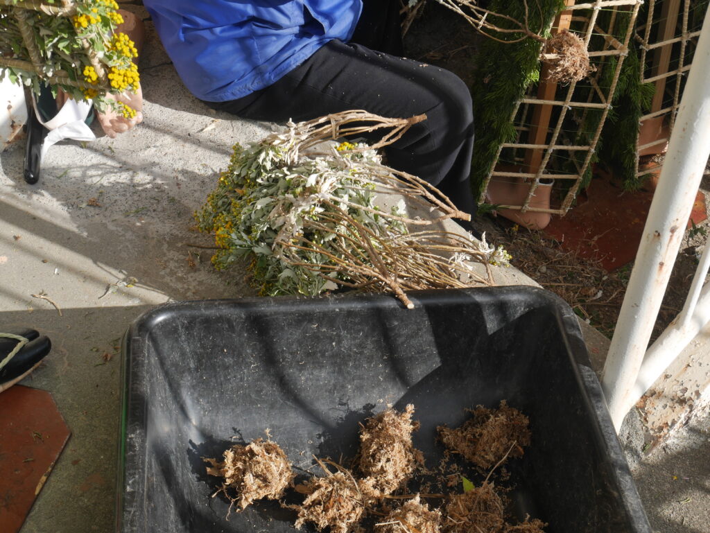 菊の根巻き(菊の根に 水苔を巻き、イ草でとめる)