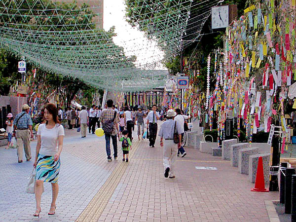 - 歩道橋に七夕飾りが取り付けられた、ふれあい通りの入口