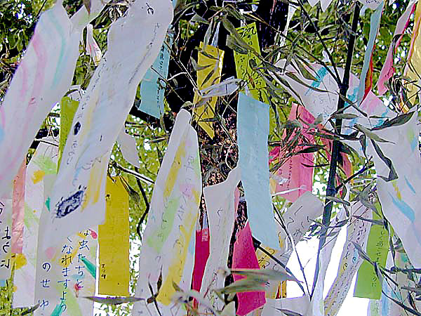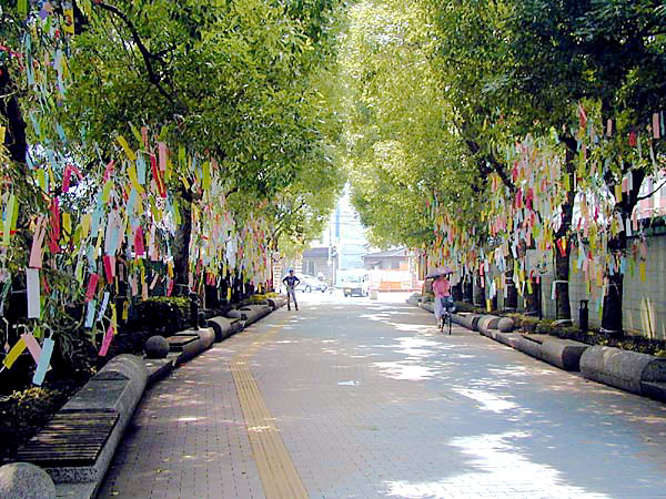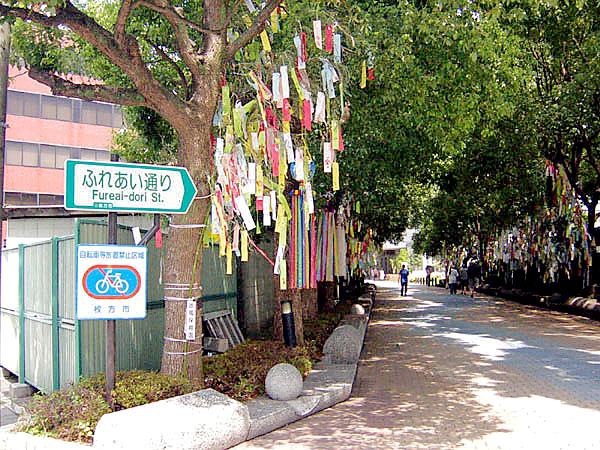- 郵便局や消防署に抜けるふれあい通り両側には、願いを込めたささ飾り