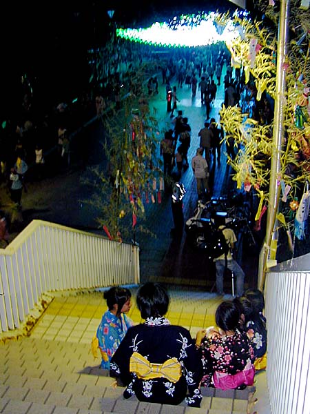 取材した8月7日(土)~8日(日)は、旧暦の七夕に併せて「天の川七夕フェスタ2004」が開催された。ふれあい通りには、市内幼稚園の園児たちの願いを込めた「七夕かざり」が一面に立てられていた。市役所別館前の駐車場に市民の店の模擬店が出されて、物産展や飲食フェアーで賑わっていた。