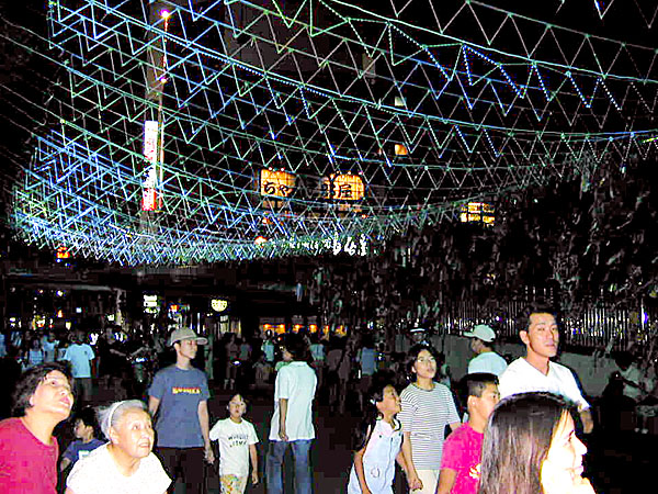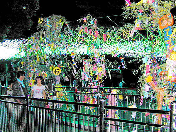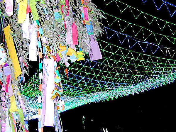 夜には天の川をイメージしたイルミネーションのライトアップ施され、鮮やかなイルミネーションと灯りに浮かぶささ飾りが情緒をかもし出していた。
