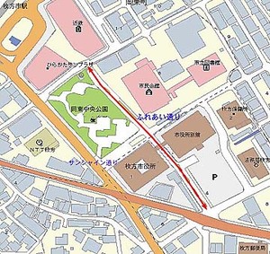 枚方市駅前の近鉄と枚方郵便局を結ぶこの通りは、市民なら誰でも一度は通るみちで、市官公庁街の中心にあるため、市関連のあらゆる行事が、この通りと岡東中央公園、市民会館前広場を使って開催される。文字通り市民のふれあい道路となっている。