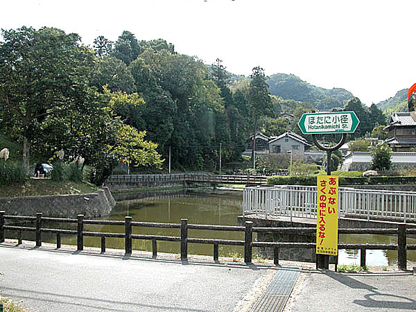 ほたに小径は公園になっている穂谷新池を回り、村の中をめぐっている小道だ。新池の周りの植え込みには萩の花が咲き、紫式部が小さな実をつけていた。池に流れ込む川沿いに小さな東屋がしつらえられ、市内の女性グループが遅い朝食を取りながらおしゃべりを楽しんでいた。小さな実をつけた柿の木が庭に植えられ、秋の草花があちこちに咲き乱れている。秋のこの季節には、ほのぼのと出来る風景の空間だ。