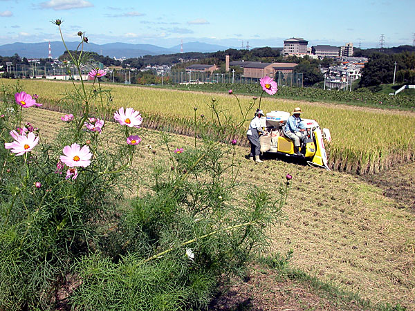 新池のすぐ東側に、枚方で唯一の造り酒屋「重村酒造」(2012年3月末で廃業)がある。余りにひなびていて今でも酒づくりがされているのか、判りづらかった。穂谷公民館の横から、だらだら下りの道を行くと、関西外大穂谷校舎に向かって休耕田を活用した穂谷コスモスの里があり、たわわに実った稲穂の間にコスモス畑やひまわりの畑があり、自分で摘んで箱に現金を入れる即売のシステムになっている。