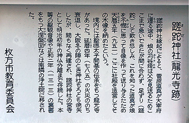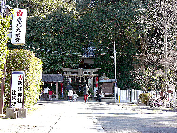 京阪光禅寺駅から香里園駅のほうへ500mほどいった線路脇に「御社蹉跎神社」の石碑がある。南中振2丁目との小さい踏み切りの向こうから蹉跎神社境内までの200mほどの参道が愛称道路になっている。
