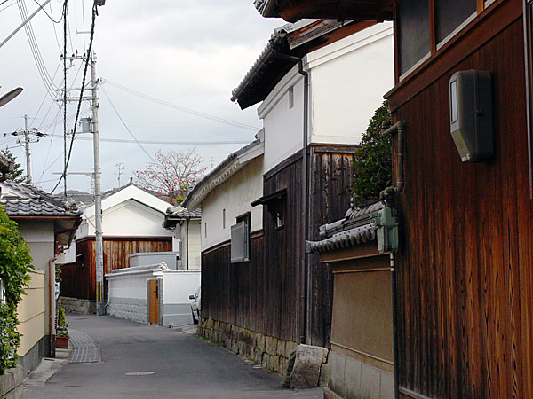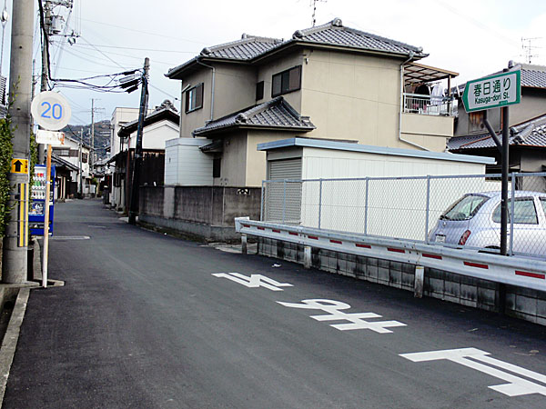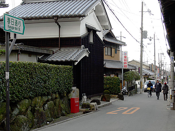 神社を出て元の春日通を行くと、中世の村らしく見通しができないよう道路がクの字に曲がっている。大きな土塀と蔵を持った旧家がいくつも並んでいる。春日西町の田んぼや畑が広がる道路とぶつかりここで終わる。