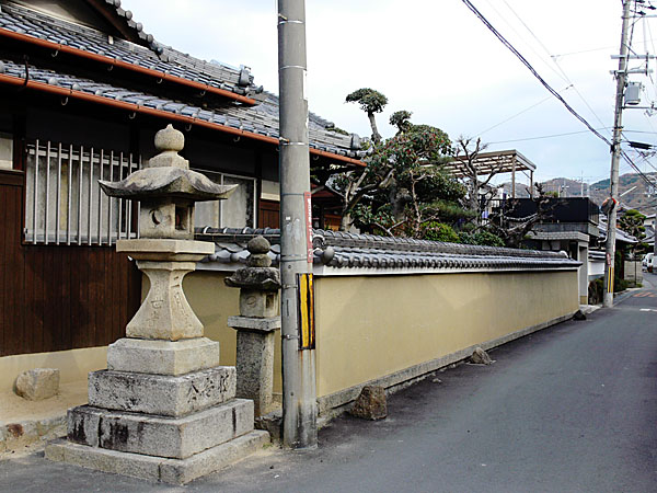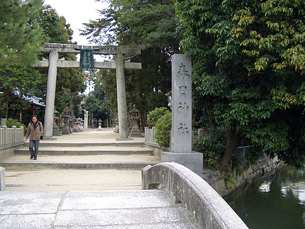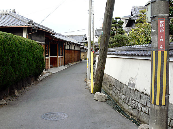 やがて一段と道が狭くなり、蔵と土塀の続く古い町並みに入る。右手の奥に大きな石灯籠がある道を入って行くと、この集落の氏神「春日神社」に出る。春日神社の前には、環濠村落の跡を残す濠があり、立派な石の橋が架かって、こんもりとした茂みと趣のある佇まいが見える。春日神社は、畠田村の祭神を分霊したものといわれ、天児屋根命・比売大神・武甕槌命・経津主命を祀っている。元は神宮寺として、薬師仏を本尊とする真言宗正楽寺があったが、明治はじめの神仏分離令によって廃寺となり、薬師仏は融通念仏宗大聖寺(春日元町2丁目)に移された。本殿は鉄筋コンクリートらしくやや趣に欠けるが、社の裏には市の保存樹木に指定された大きな楠が茂っている。
