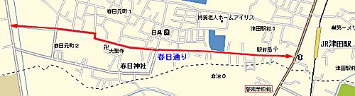 - JR津田駅南、府道交野久御山線から右に折れると春日通りのスタート