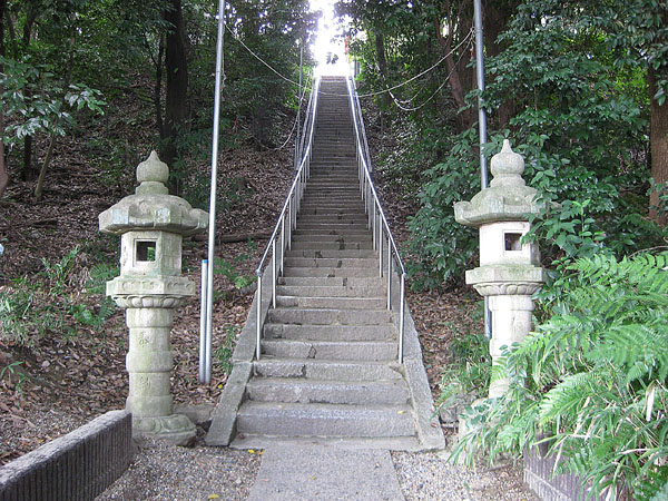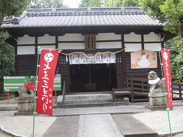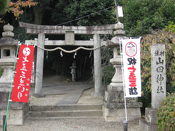 枚方発見神社シリーズの第7回目として「山田神社」を取材しました。この神社は京阪バス「宮の前橋」停留所より山田神社口交差点を経て徒歩約3分の所にあります。道路に面した鳥居をくぐると森に囲まれた急な石段の参道があり、その上に本殿、弊殿、拝殿、土蔵を容する境内地があります。また、末社として本殿内に「春日神社」と「石神社」、境内地内に「稲荷神社」が祀られています。