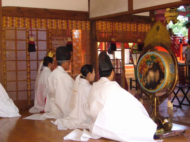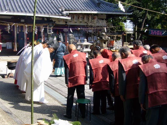 - 秋の大祭が10月14日(宵宮)15日(本宮)予定されていて、当日もお参りさせていただきました。宵宮では大勢の子供たちが太鼓を叩いたり、夜店で買い物したりして楽しんでいました。また、夜のお神楽が厳粛に執り行われていて対照的な感じを受けました。この子供たちが成長して、氏子に加わって歴史をつないでいくのだと感じました。本宮では1時間半にわたって神事が執り行われ、30名くらいの氏子代表の方が揃いの法被を着て参加され、各地域団体の方が数名、玉串を奉納されていました。地域に密着した神社であると感じました。