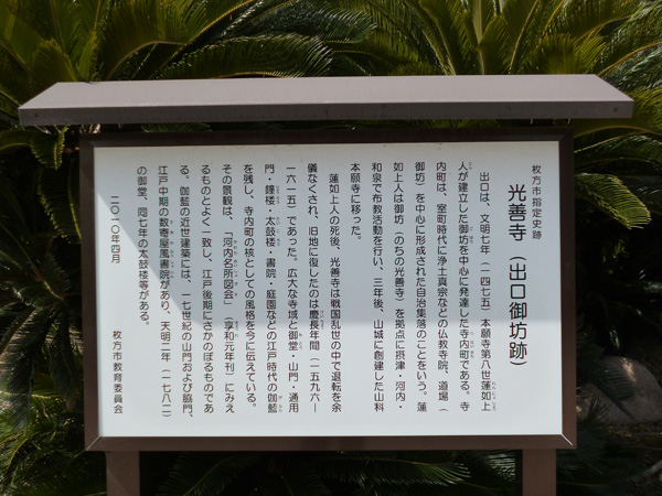 2. 枚方市指定史跡 光善寺(出口御坊跡) 光善寺境内設置の説明板:枚方市教育委員会 2010年4月