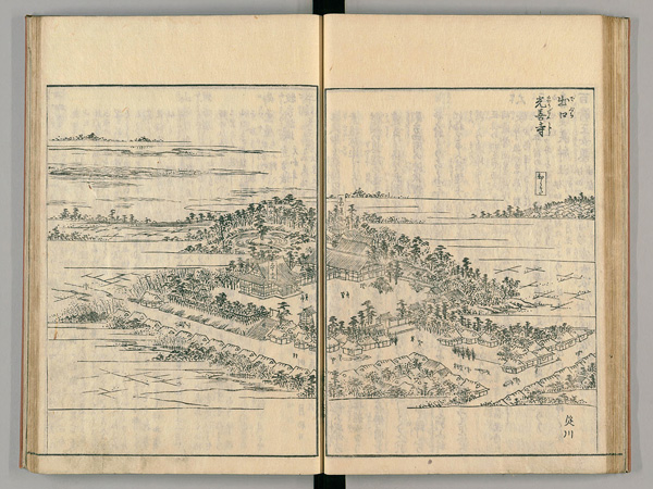 そして130年後、出口の里に立派な寺が建てられました。淵を埋め立てて建てられたということから、「淵埋山光善寺」と名づけられました。「光善寺」の景観は、「河内名所図会」(享和元年刊)に掲載されており、山門、広大な寺域と本堂、竜女池、庭園、鐘楼、太鼓楼などが確認できます。