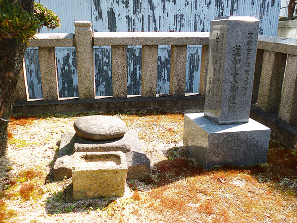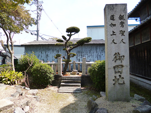 光善寺から南に100mほど行ったところの路地の角に「親鸞聖人 蓮如上人 御田地」という表示の石碑が立っています。御田地とは説教をした場所ということのようです。さらに近づいて見ると「蓮如上人御遺跡」と表示されている石碑があり、その側面には説教された場所の「箕屋」という記載も確認できます。この石碑のわきに丸い形状の蓮如上人の「腰掛石」があります。比較的小さい石であるという印象を受けました。またその横には「腰掛石」を説明する平板の石碑が立てられています。