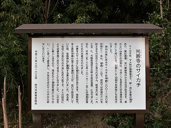 3. 光善寺のサイカチ      光善寺境内奥設置の説明板:枚方市教育委員会 2016年3月