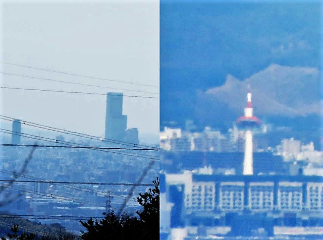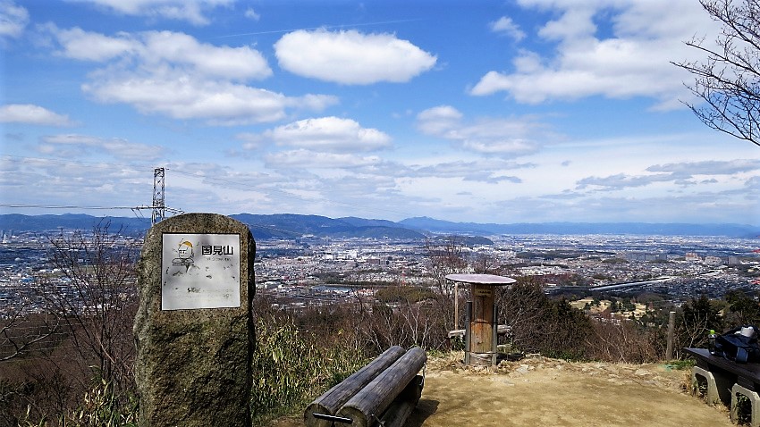 JR学研都市線・津田駅の東の方に見える山並みの北の端の小高いところが、高さ285mの国見山です。頂上近くの案内板には、1490年頃津田周防守正信が、この国見山を選んで山城を築いたとの説明があります。山頂に立つと四方が見渡せ、どこまでも広く続く景色は『枚方八景』の一つにもなっています