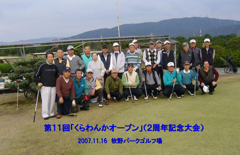 第11回のくらわんかオープンは2007年11月16日に牧野パークゴルフ場にて開催しました。 今回はくらわんかオープンがスタートして満2年の記念大会ということで、久し振りに参加された方もおられました。終日曇天で初冬のやや肌寒い天候の下、平均スコアが92という高レベルのコンペでした。24名参加の中で、栄えある優勝者はベスグロも獲得した植田豊年さんでした。
