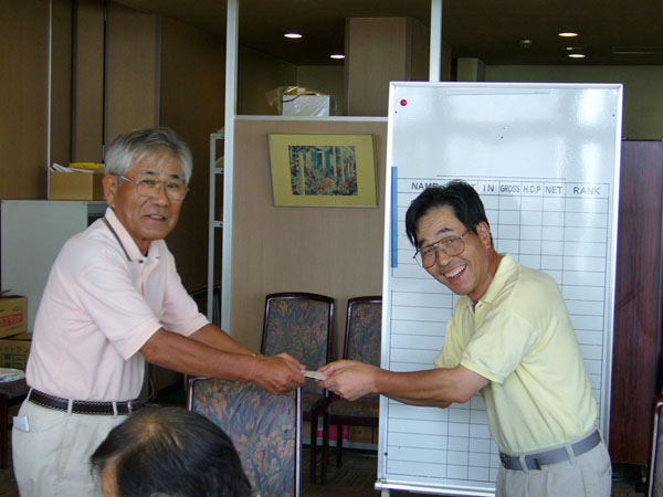 第14回のくらわんかオープンは2008年7月18日に牧野パークゴルフ場にて開催しました。スコールのような激しい雨が時折やってくる梅雨明け特有の蒸し暑い天候の下、平均スコアが92という高レベルのコンペでした。27名参加の中で、栄えある優勝者は事務局長の金箱勝之さんでした。