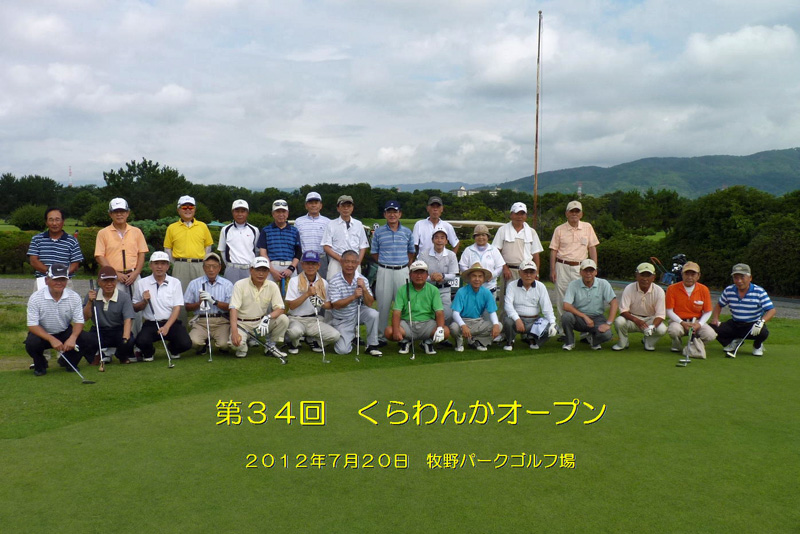 第34回くらわんかオープンは2012年7月20日に牧野パークゴルフ場にて開催し、28名が参加されました。朝方の雨でフェアウエィやグリーンはしっとり状態、プレー中も時折の小雨に遭遇するも、まずまずのゴルフ日和となりました。