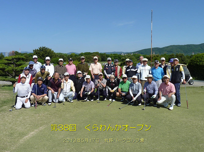 第38回くらわんかオープンは2013年5月17日に牧野パークゴルフ場にて開催し、32名が参加されました。雲一つない皐月晴れの下でのプレーで、楽しいゴルフ日和となりました。