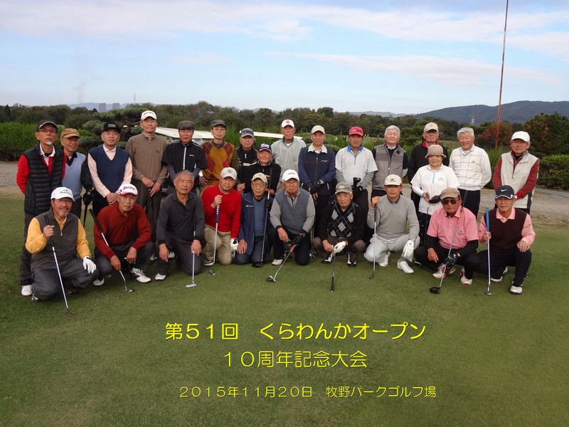 第51回くらわんかオープン(10周年記念大会)は2015年11月20日に牧野パークゴルフ場にて開催し、26名が参加されました。 早朝の雨が嘘のように晴天となり、晩秋にしては暑いくらいの空の下で楽しいゴルフ日和となりました。