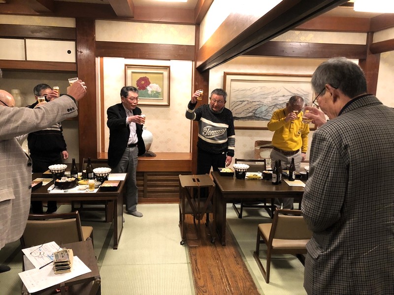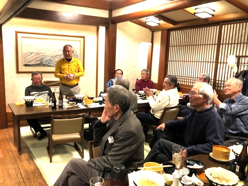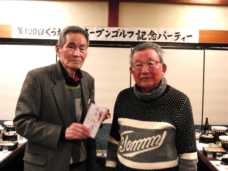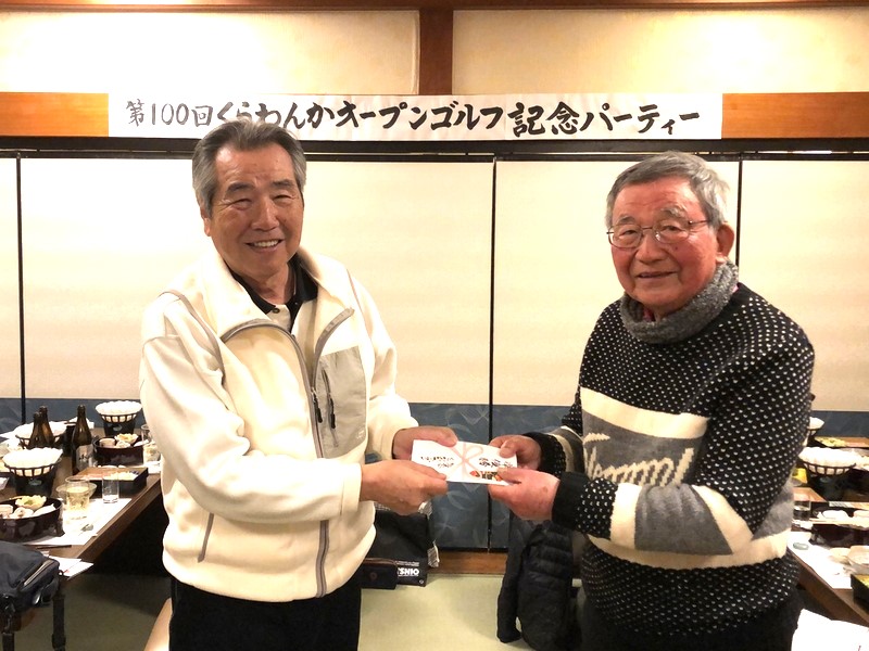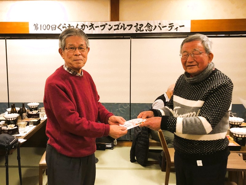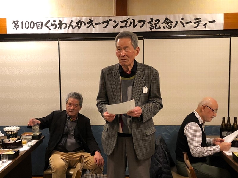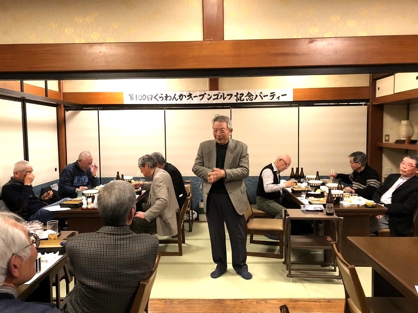 朝から強風の中で牧野パークゴルフでプレー終了後、夕刻にあらためて「枚方がんこ」に21人が集合して、「くらわんかオープン100回記念パーティー」を盛大に楽しく開催しました。
