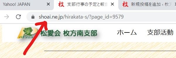 URLはページの画面の上部に示され、右画面の ➡ で示した箇所に、https://www.shoai.ne.jp/hirakata-s/・・・・・・ と表示されています。