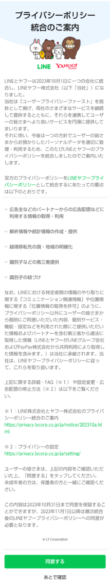 10月1日にLINEとヤフーが一つの会社「LINEヤフー」に統合したのを機に、両社のプライバシーポリシーを統合した「LINEヤフープライバシーポリシー」が策定・公表されており、10月4日から順次、LINEやヤフーの各サービス内で同意画面が掲出されており、 新しいプライバシーポリシーへの同意を求めています。  「よくわからないから、とりあえず保留」――。そんな人も多いかもしれないが、保留のままにしていると、10月中は保留できても11月以降は同意するまでの間、LINEアプリやYahoo!メールなどの継続利用ができなくなるということです。