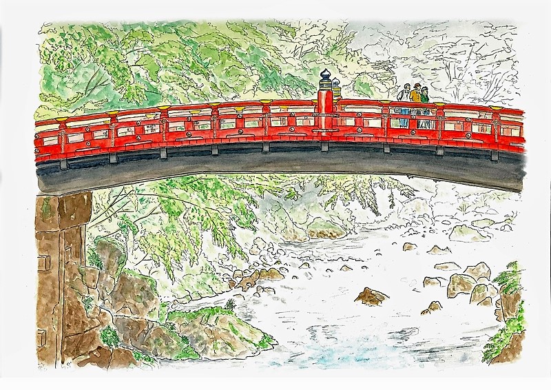 日光神橋の絵は、好きで、描くのは4枚目です。描く度に雰囲気が変って面白いです。雨上がりで川の水量が増していて、流れが速く白くなっています。少し霧が掛っている感じが出ていますか?