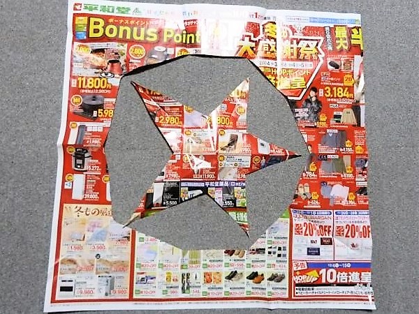下記の様な四角い広告を折ってから鋏で切出した残りが、写真の様に本体は〇なのに、切出した残りが☆型になる。