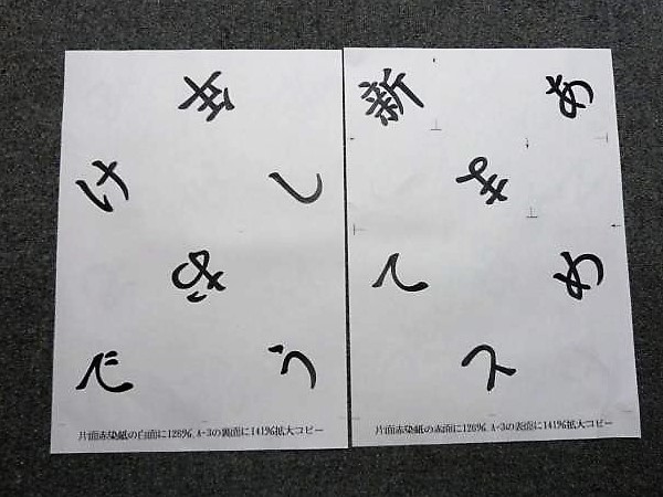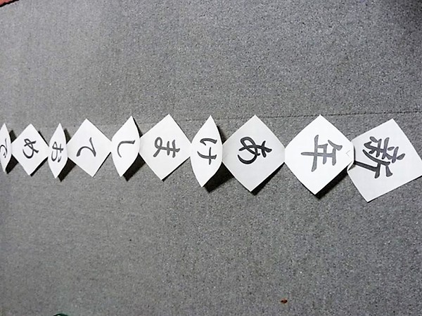下記の様な傾いた文字が裏表に書かれた紙を折る→切る→折る・・・を繰り返して、細かくなった紙片を広げると「新年あけましておめでとう」の繋がった文字が現れ、子供たちに順番にちぎってもらい、ゴミ袋に捨ててもらう。