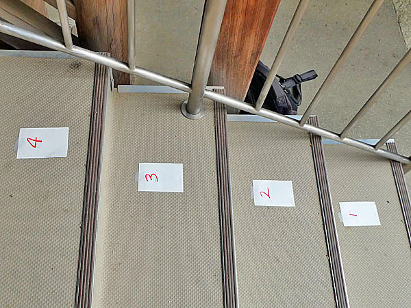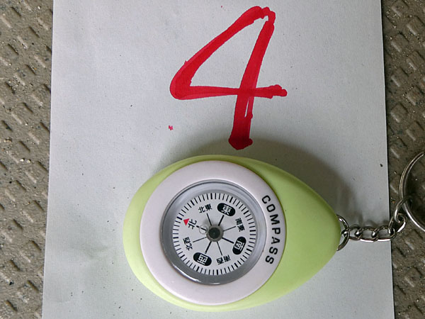 方位が変わる点は「本殿階段の下から3段目右端付近」という情報をもとに、その場所に直行し上下数点を測定しました。確かに地点3付近で、約90度方位指示が変わることを確認できました。磁気ゼロかどうかは「ガウスメータ」という測定器が必要ですので明確ではありませんが、方位は変わりますので「磁束密度」も変わっているとは推測できます。(地点1&4は、他の離れた場所と同じ方位指示です)