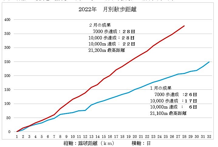 1月:体調不良・天候不良で、第一目標:7,000歩、第二目標:10,000歩、第三目標:10,000m の達成目標が自身で納得できていません。