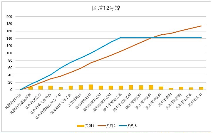 相変わらず国道も仮想で歩いています。2月19日に国道12号線の札幌を出発して2月28日迄に踏破したのが、次のグラフと地図です。砂川市・滝川市辺りまで歩けました。オレンジ色の折れ線は初期の設定です。10kmを超える区間をなくすように設定しています。青線が実績です。棒グラフは日毎の目標距離です。